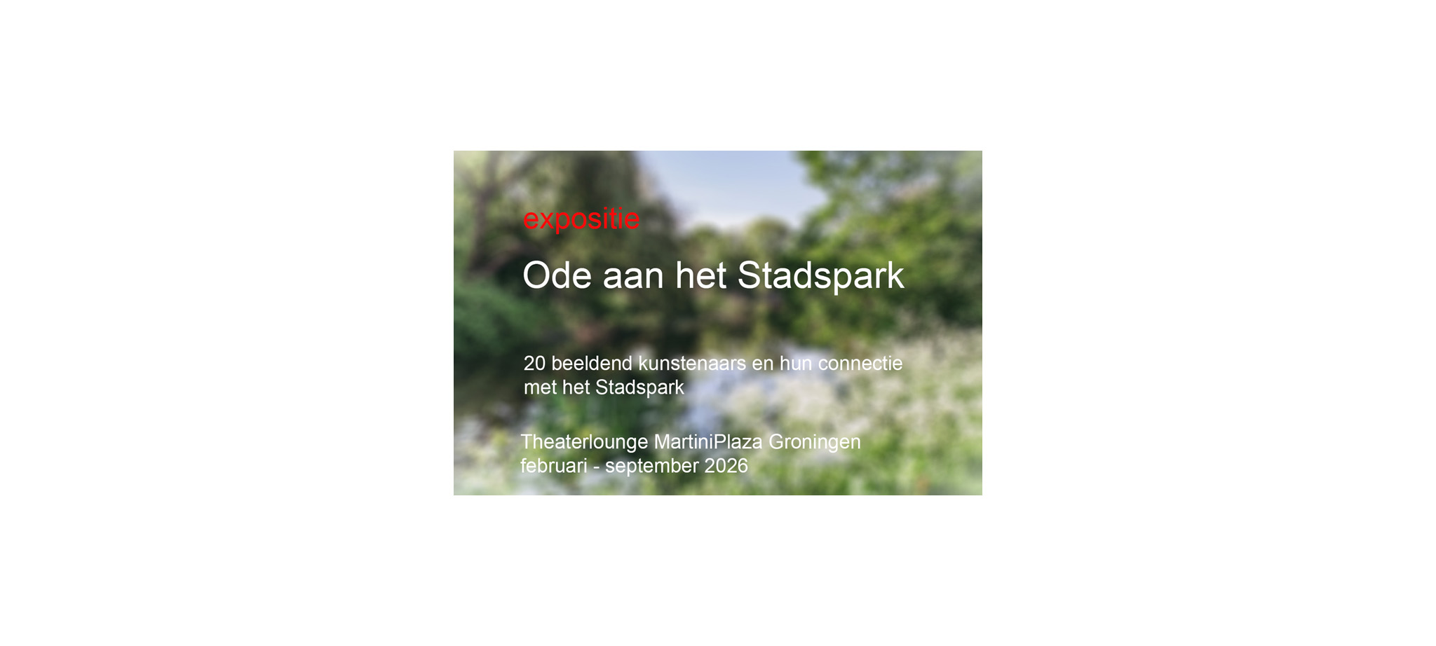 Op 15 februari opende Stichting Art Promotion International de nieuwe expositie Ode aan het Stadspark in de theaterlounge van MartiniPlaza Groningen. De tentoonstelling volgt de expositie met illustratiekunst van INKT.PRO op en vormt de aftrap van het jubileumjaar waarin het Stadspark zijn 100‑jarig bestaan viert.